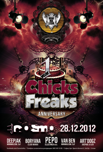 Очаквайте много музикални изненади, приятна атмосфера и незабравими емоции. За нас ще бъде удоволствие и привилегия да ви приемем в семейството на Chicks & Freaks, както и да ви представим новият хаус клуб на София - Cosmo !!!