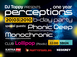 Проектът PERCEPTIONS ще отбележи една година от създаването си с подобаващо по мащаб събитие. За юбилейното издание, освен резидента DJ Toppy, специални гости ще бъдат PhonicDeep и Monochronic - две от най-изявените имена на българската електронна сцена.