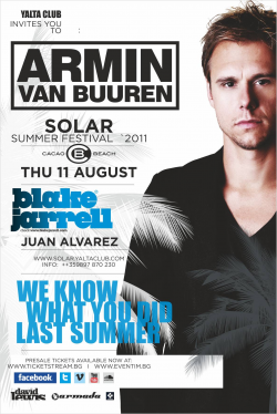 Armin, we know what you did last summer и сме сигурни съм, че тази година ще е още по-велико! С Armin на Solar пристига новоизгряващата американска звезда Blake Jarrell, който ще подгрее публиката за излизането на световния любимец. (http://www.youtube.com/watch?v=-LSOUv4Q0VE&feature=related).