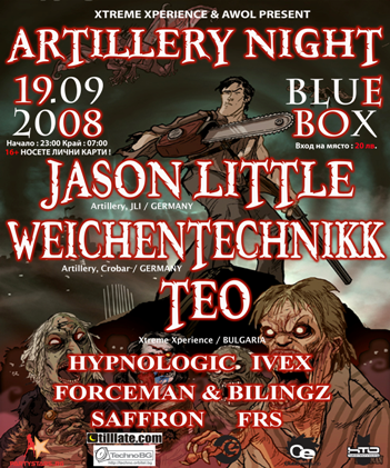 На 19-ти септември, специално за почитателите на мощният електронен саунд CLub Blue Box – София, ще посрещне двамата световни посланици на твърдата електронна музика. WEICHENTECHNIKK и JASON LITTLE са главните виновници за големите петъчни очаквания на хилядите млади меломани. През последните години са свирили на много големи партита и фестивали в цял свят. Стилът им като DJ е същият като продукцията им - безкомпромисно хард техно. Уникалният line up подбран от Xtreme Xperience за първото издание на фестивала ARTILLERY NIGHT, говори сам по себе си за заряда на осем часовият саунд маратон. На следващата сутрин предстой още по тежко афтър парти във Club Pulse. Повече инфо за него, съвсем скоро.