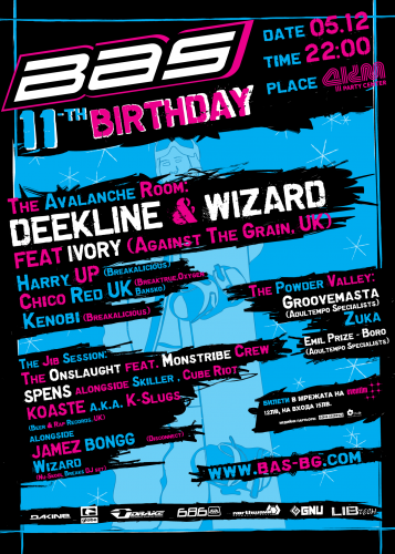 На 5-ти Декември (ако дойдеш, вместо да останеш да гледаш Бай Брадъра) ще се забавляваш и ти. Специално за рождения ден от Лондон ще пристигнат цели 4 диджея, които ще дадат всичко от себе си за да може това да се случи. Три зали – три стила – брейкбийт, хип-хоп и фънк. В основната зала – The Avalanche Room - ще можеш да чуеш Deekline & Wizard. Те са дуо, широко известно в Urban Dance средите, чиято музика е силно повлияна от Miami Bass, Hip Hop, UK Garage, 80's B-Boy Electro и разбира се Breakbeat музиката, правена в най-големите световни денс арени, където двамата са с постоянно присъствие. През 2004-та издават един от най-иновативните и модерни дискове Breaks Beats and Blonde's, който буквално преобръща представата за Breakbeat. През 2005-та нещата вървят от добре към по-добре с изпълнения на живо по Radio One и XFM, един от най-добрите ремикси за годината с Armand Van Helden - MY MY MY и огромно турне в Австралия и Северна Америка, както и безспорният номер едно в Германия ремикс на Out Of Space на Prodigy. 2006-та ги среща с вторият им албум – Live From Brixton в който участват още Yolanda, Top Cat, DJ Assualt, Tenor Fly, Wiley и Ivory, който ще им помага и в София. Deekline & Wizard готвят нов диск, който ще излезне веднага след нова година, а на 5-ти ще можеш да чоеш голяма част от него.