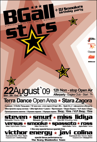 Поредният масов open air организиран от "стопаните" на старозагорския парти регион - Hitex Promotions a.k.a. Versus & Smooke. Този път едни от топ диджеите на всеки един главен регион на България в перфектна комбинация, но стилово разнообразни! Пикантен бонус към партито - 2ма гост диджей от Испания, които ще направят своя дебют на Българската сцена. С тях диджеите ангажирани с приятното задължение да Ви забавляват в продължение на половин денонощие стават точно 9. Този път имаме и повод за празник, а именно рожден ден на DJ Smooke. На колко става? Тайна!