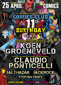 Легендарният варненски клуб Comics, един от основоположниците на клубната хаус и техно сцена в България, навършва 11 години от създаването си! Поводът ще бъде отпразнуван със скандално парти на 25 април, като организаторите от Renesanz са поканили специално за вечерта двама гост-диджеи – холандския топ продуцент Koen Groeneveld и италианския минимал техно маестро Claudio Ponticelli. Освен тях зад пулта ще се изявят и българските диджеи Balthazar, JackRock и Stephan Panev. Визията на клуб Comics ще бъде допълнително подсилена от лазерно шоу. Събитието ще има и официално афтърпарти, което ще се проведе в клуб La Playa.