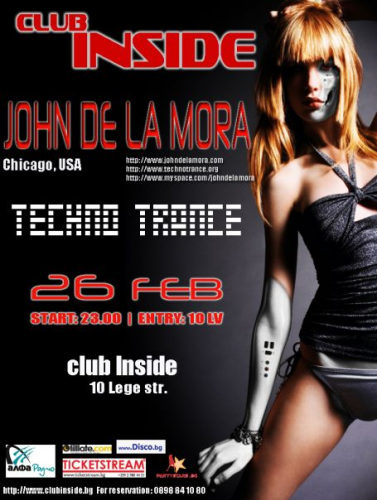 Г-н Де Ла Мора със сигурност ще ви взриви с един красив и хипнотизиращ сет от Транс & Техно. "Разбира се, не мога да разкрия какво точно ще звучи тази вечер", каза Джон Де Ла Мора. "Но, ще кажа, че изключително мощни и динамични мелодии ще бъдат част от сета тази вечер. Ако сте в София или в близост - няма да искате да пропуснете тази нощ. Ще бъде лудост. "
