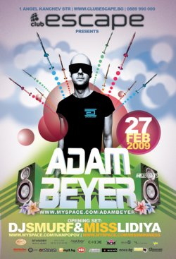 По-малко от 2 седмици остават до най-чаканото събитие от феновете на Adam Beyer в България. Шведската техно легенда още през ноември потвърди гига си на 27 февруари в столичният клуб Ескейп, с което хвърли в блаженна истерия верните на техното последователи у нас. Adam Beyer е едно от най-известните имена на глобалната музикална сцена. Метеоричното му изгряване на световната алея на славата е в началото на 90-те, когато категорично поставя родната си Швеция на техно картата на Земята. Високият над 2м швед е бил в почти всяка точка на света и може да се похвали с глобална мрежа от последователи, които само в MySpace днес надхвърлят 50 000. Един от най-активните ди джеи в бизнеса е главната движеща сила зад топ лейбълите Drumcode, Truesoul, Code Red и Mad Eye и възторжено приетите от критиците и публиката албуми Decodec (Planet Rhythm 1996), Protection (Drumcode 1999) и Ignition Key (Truesoul 2002). Заедно с други бележити артисти от Стокхолм (Cari Lekebusch, Joel Mull, Henrik B) Adam Beyer е станал синоним на шведският техно саунд и си остава един от най-големите и вдъхновяващи ди джеи-продуценти на планетата. Партито на 27-ми ще подгреят достойно техно тандема Смърфа от Mетрополис и Мис Лидия.