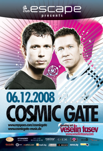 Верен на максимата за всеки по нещо, клуб Ескейп ще бъде мощна притегателна и за почитателите на транса, които тази събота пък ще се насладят на германското дуо Cosmic Gate, без които бумът на транс музиката в края на 90-те нямаше да е същият. Claus Terhoeven (Nic Chagall) и DJ (Bossi) идват в София малко преди издаването на четвъртият си самостоятелен албум, очакван да излезе на пазара в началото на 2009.