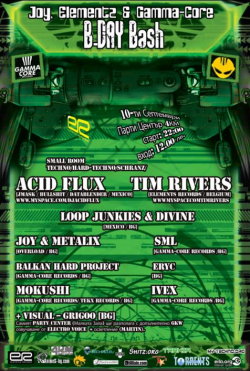 По време на събитието ще се отпразнуват два рождени дни единият на DJ Joy - добре познатият на техно и хард техно аудиторията ни, а вторият - една година от създаването на първия български дигитален хард техно лейбъл Gamma-Core Records и белгийският Elementz Records, зад който стои именно Tim Rivers.