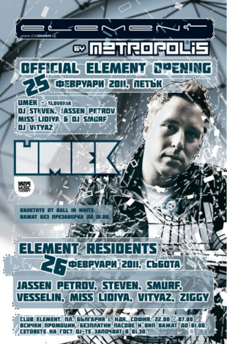 Стивън, Смърфа и Ясен Петров поднесоха още една добра новина на почитателите си потвърждавайки новата дата за Умек – 25 февруари. Словенският топ диджей пропусна последното изданиe на Бaл в Бяло, но успя бързо да вмъкне София в натоварения си календар и официално ще открие клуб Еlement следващия петък. Метрополис ще спазят обещанието си всички закупени билети от 26 ноември да важат без презаверка, като поставят единственото условие, че влизането с тях трябва да се случи до 1:00 часа. За тази цел вратите се отварят още в 22:00. В първата събота (26 февруари) след откриването зад пулта в клуба ще застанат всичките му резиденти Стивън, Ясен Петров, Смърф и Мис Лидия, Витяз, Зиги и Петър.