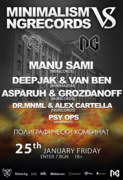 След като слуховете за края на света бяха очаквано опровергани, стана ясно и първото ТЕХНО събитие в календара ни за новата 2013 година. Два от най-успешните Български лейбъла (Мinimalism & NGRecords) се обединяват в епична битка, която ще се проведе във вече добре познатата ви парти локация - ПОЛИГРАФИЧЕСКИЯ КОМБИНАТ на Цариградско Шосе №47 (влиза се през централния вход, след което се слиза по стълбите в дясно). Залата е с капацитет 400 души, а цените на бара са супер народни!