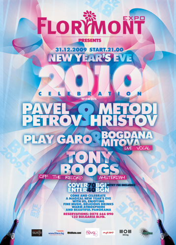 Тази Нова година имате възможността да видите светлините, които ще огреят София в полунощ от друг ъгъл. Florimont е мястото, което ще разкрие една красива панорамна гледка в празничната вечер. За вашето настроението ще се погрижат Play Garo & Bogdana Mitova (live vocal), Pavel Petrov & Metodi Hristov, както и специалният гост в програмата Tony Boogs (Amsterdam). Подготвили сме ефектно осветление, фойерверки и качетвено озвучение (FUNKTION-ONE).