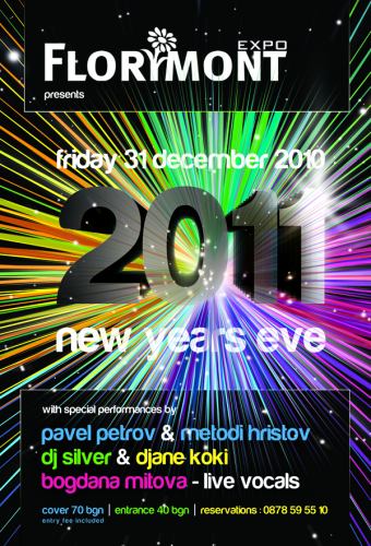 И тази нова година ще имате възможността да видите светлините които ще огреят София в полунощ и ще посрещнат новата 2011-та. Florimont EXPO е мястото което ще разкрие една красива панорамна гледка в празничната вечер. За вашето настроение отново ще се погрижат Pavel Petrov & Metodi Hristov, а специални гости този път ще бъдат добре познатите ни DJ Silver и Djane Koki, също така в началото на вечерта залата ще бъде огласена от невероятната Богдана Митова чиито глас до скоро звучеше от националния ефир. И Тази година домакините са се погрижили за ефектно осветление, пиро ефекти и качествен звук, за да бъде посрещането на новата година наистина запомнящо се.