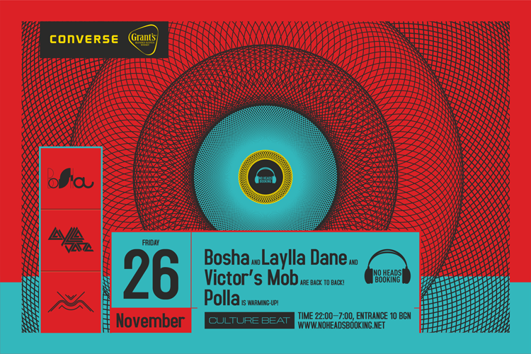 На 26-ти ноември Сдружението за ПРЕТЕНЦИОЗЕН клубен звук - No Heads Booking, Ви кани на 3-пластово музикално изживяване. Третото събитие на NHB в Culture Beat club ще стартира точно в 22:00 часа с Polla, която ще загрее пулта до 24:00. И когато стрелките ударят полунощ, в пълния си блясък ще се материализират Bosha, Laylla Dane и Victor’s Mob. Сходността в музикалните им предпочитания сглобява идеята за back-3-back - формат, който неминуемо ще забърка мармалад пред и зад пулта.