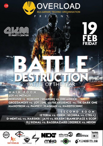 Време е за битка! Битка, която е в състояние да разруши всичко! Всепомитащата сила на тежкия електронен звук е готова за пореден път да помете останките на музикалната посредственост в България. Причината за това е поредното обединяващо събитие, организирано от Overload. В тазгодишното издание на Battle Destruction ще се включат редица организации, съсредоточени върху тежкия бас и екстремния bpm. По традиция мероприятието ще се проведе в средата на месец февруари (19-ти, за да бъдем точни) в Party Center 4km, а на сцената ще видим представители на: Gabbafreakz, Music Pirates, Bass Box Crew, Sketches, Techsys / Mental Disorder Recordings и разбира се – Overload.
