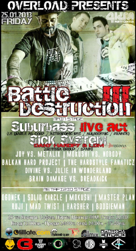 На 25 Януари, петък, столичният парти център 4КМ ще стане домакин на следващото парти от поредицата “Battle Destruction” на OVERLOAD. Хедлайнери за вечерта ще бъдат SUBURBASS (Франция), SICK SYSTEM a.k.a. DANY HARDPY & LDM (Испания). Партито ще се вихри едновременно на две сцени: Main Stage и Metafiziq Stage, като на тях заедно с гостите ще се изявят 25 български диджеи и продуценти, сред които:
