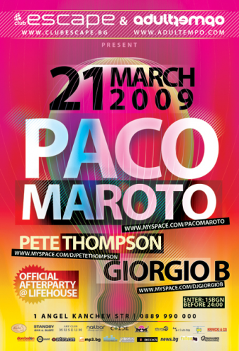 След италианското торнадо Roma минал през Ескейп миналата седмица, по добре затегнете коланите за втората вълна този уйкенд. В събота софийският топ клуб заедно с AdultTempo ще ви срещне с едно от нaй-големите имена на испанската хаус сцена. Paco Maroto e сред доайените на балеарският звук с повече от 15 години опит зад грамофоните. Уважаваният ди джeй и продуцент обръща специално внимание на енергичната прогресив музика миксирайки я със свежи, стилни и елегантни груув елементи. Днес сесиите му от напомпан тек хаус омесен с дръзки и ефектни електро звуци са се превърнали в една от причините за еволюционното сливане на тези стилове.