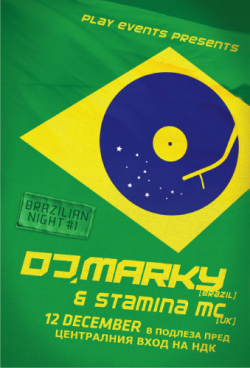 Бразилската трасферна цел номер едно на всички европейски клубни грандове DJ Marky - пристига на проби в София на 12 декември !!! Наскоро учредения клуб на Play Events ще направи поредния трансферен удар с поканата на бразилската звезда Dj Marky, малко преди края на трансферния прозорец за 2008. Играчите от Play Events по-рано през годината успяха да привлекат още Dj Food, Coldcut, Dave Clarke и японеца Dj Krush. Ако горната информация ви се вижда странна (футболна), това означава, че не сте разбрали нашето послание, което има за цел да ви информира за предстоящята “Бразилска вечер” организирана от Play Events на 12 декември със специален гост бразилсия Dj Marky и MC Stamnina.