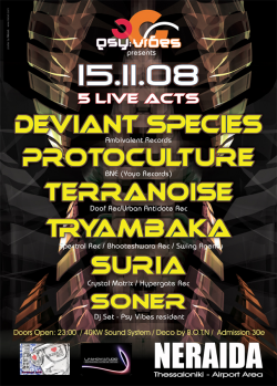 Sakis, aka Soner from Thessaloniki, was born in 1980. Being involved in the trance scene since 1996, started djing at parties in Thessaloniki since 2001 and later he joined the Psy Vibes crew. His music style is full-on trance.