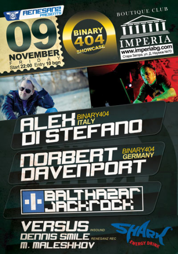 Самият Alex Di Stefano, който е хедлайнер за вечерта, няма нужда от особено представяне - той е eдин от най-горещите техно артисти през последните 3 години, с постоянно присъствие в класациите на Beatport и участия във всички точки в света. Заедно с него пристига Norbert Davenport от Германия, който е другия основен артист на лейбъла. Лайнъпът на шоукейса се допълва от Balthazar и JackRock, които миналата година издадоха за Binary 404 суперхита Puerto Rico, с ремикси на Alex Di Stefano и Dandi & Ugo. Заедно с отбора на Binary 404 зад пулта ще застанат още диджеите Versus, Dennis Smile и M. Maleshkov.