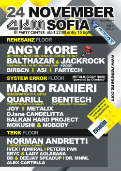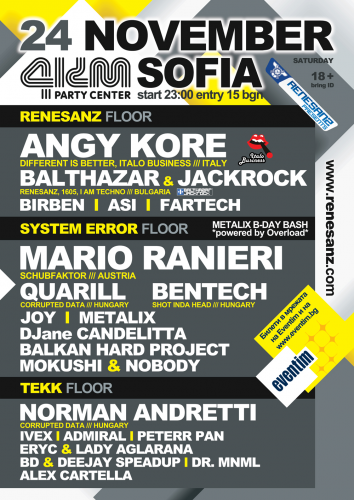 На 24 Ноември, събота, столичният парти център 4КМ ще стане домакин на следващото голямо събитие на Renesanz. Хедлайнери за вечерта ще бъдат ANGY KORE (Италия), MARIO RANIERI (Австрия), QUARILL (Унгария), BENTECH (Унгария) и NORMAN ANDRETTI (Унгария). Партито ще се вихри едновременно на три сцени: Renesanz floor, System Error floor и Tekk floor, като на тях заедно с гостите ще се изявят повече от 20 български диджеи, сред които се открояват имената на Balthazar & JackRock, Birben, Fartech, Joy и др. Билети на цена 15 лв. се продават в мрежата на Eventim в цялата страна - във веригите GERMANOS, JEFF, MULTIRAMA, PC EXPERT, OFFICE 1, ORANGE, USIT COLOURS, ПИКАДИЛИ, ТЕХНОМАРКЕТ, ТЕХНОПОЛИС, както и всички бензиностанции OMV.