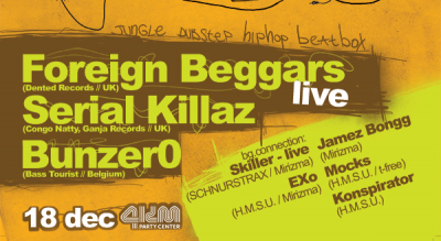 The CONTACT event, organized by the Mirizma crew and taking place at Partycenter 4KM in Sofia on December 18th will make the public familiar with three fast-forward international acts . The headliners are the well-known hip-hop/grime artists Foreign Beggars, who come to Bulgaria for the second time, after their super massive show here in 2008. Another guest, visiting Bulgaria for the first time, is the Belgian DJ bunzer0 – a dubstep virtuoso, who will mash up the place with his uncompromising selection of unreleased tracks. The third special guest for the night is the jungle project Serial Killaz, known to the public with the Congo Natty remixes and Ganja Records releases. No later than the beginning of December, the tickets will be sold at a preferential price of 15BGN. Afterwards, the price goes up to 20BGN and – at the day of the event – 25BGN.
