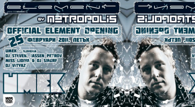 Стивън, Смърфа и Ясен Петров поднесоха още една добра новина на почитателите си потвърждавайки новата дата за Умек – 25 февруари. Словенският топ диджей пропусна последното изданиe на Бaл в Бяло, но успя бързо да вмъкне София в натоварения си календар и официално ще открие клуб Еlement следващия петък. Метрополис ще спазят обещанието си всички закупени билети от 26 ноември да важат без презаверка, като поставят единственото условие, че влизането с тях трябва да се случи до 1:00 часа. За тази цел вратите се отварят още в 22:00. В първата събота (26 февруари) след откриването зад пулта в клуба ще застанат всичките му резиденти Стивън, Ясен Петров, Смърф и Мис Лидия, Витяз, Зиги и Петър.