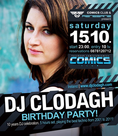 Очарователната ирландка DJ Clodagh и тази година избра Комикс клуб за да отпразнува своя рожден ден! Събитието този път ще е още по-специално, тъй като любимката на Carl Cox отбелязва и кръгла 10-годишнина на сцената, а партито е част от нейното турне '10 years DJ celebration'.