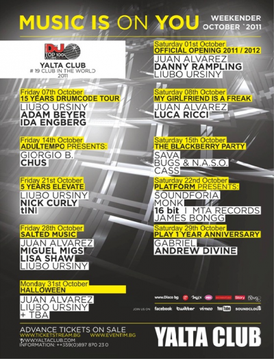 Няма как и DJ Chus да пропусне Yalta Club и през новия сезон. Той идва на 14 октомври с типичното си иберийско звучене. Испанецът е част от голямото семейството на лейбъла Stereo Productions, но издава парчета и за лейбъли като Defected in the House. В събота от Yalta рязко обръщат стила музика, защото заедно с Nightline Entertainment са подготвили още едно THE BLACKBERRY PARTY. На 15 октомври всички да са на линия за месечната си порция солидни old school бийтове и най – новото от хип – хоп и R’n’B ритъма! На 21-ви октомври Elevate празнуват 5-тия си рожден в Yalta Club, а специално за партито идват фаворитите ни Nick Curly и tINI. На 22-ри най – новия промоутърски екип у нас за dubstep и ърбан култура - PLATFORM представят явлението в dubstep музиката - 16bit.