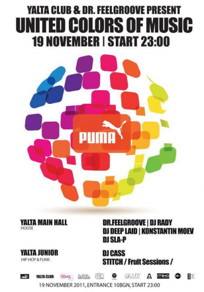 Измина повече от месец от първото издание на United Colors of Music в Yalta Club. И ето, че дойде време отново да съберем любимите си стилове в музиката на едно място. На 19-ти ноември Dr.Feelgroove, PUMA SOCIAL и Yalta Club са се погрижили да не ни е никак скучно.