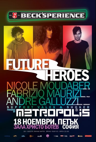 «Музиката ми е много перкусив и носи духа на Африка където израснах заобиколена от барабани, чиито ритъм разбирам и чувствам от ранна възраст», твърди хедлайнерката на Future Heroes и макар веднага да се сещаме за перкусив техно Nicole не обича ограничаването със стилови етикети. Така, че бъдете готови за незабравима комбинация от dark и driving баслинии, дълбоки техно ритми смесени с груви и перкусив елементи в часовете след полунощ на 18 ноември в зала Христо Ботев. Компания на дамата с гореща кръв зад пулта ще направят младата звезда Fabrizio Maurizi от Minus (лейбъла на Richie Hawtin) и Аndre Galluzzi от Cocoon.