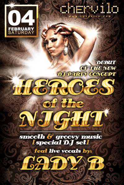 Стиловата насоченост на вечерта е funky, deep, jazzy & disco house. Зад пулта ще застанат двамата диджеи от Heroes Of The Night, а сетовете им ще бъдат допълвани от кадифените лайв вокали на R&B дивата LADY B.