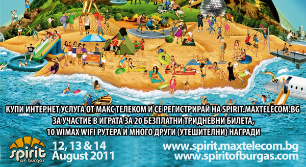Купи интернет услуга от Макс Телеком и се регистрирай за участие в играта за: 20 безплатни тридневни билета, 10 WiMax WiFi рутера и много други (утешителни) награди на адрес: http://spirit.maxtelecom.bg/